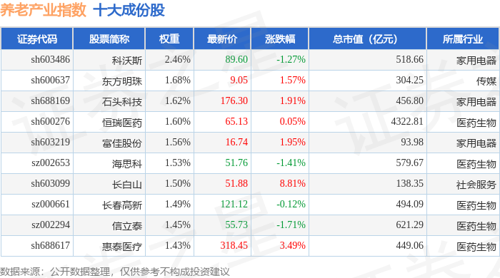 证券之星消息,10月20日,养老产业(399812)指数报收于6463.17点,涨0.28%,成交337.69亿元,换手率0.77%。当日该指数成份股中,上涨的有42家,长白山以8.81%的涨幅领涨,下跌的有37家,菜百股份以6.04%的跌幅领跌。