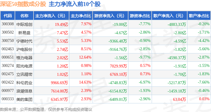 资金流向方面,深证50(399850)指数成份股当日主力资金净流入合计15.11亿元,游资资金净流出合计26.56亿元,散户资金净流入合计11.45亿元。成份股资金流向详情见下表: