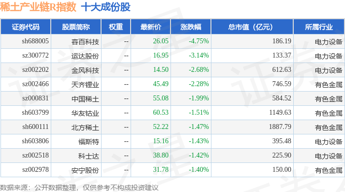 资金流向方面,稀土产业链R(489013)指数成份股当日主力资金净流出合计28.42亿元,游资资金净流入合计2.77亿元,散户资金净流入合计25.65亿元。成份股资金流向详情见下表: