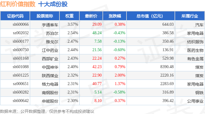 证券之星消息,10月20日,红利价值(980103)指数报收于3196.1点,涨0.28%,成交281.19亿元,换手率0.44%。当日该指数成份股中,上涨的有31家,山煤国际以5.38%的涨幅领涨,下跌的有19家,航民股份以2.18%的跌幅领跌。