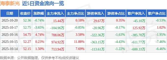 证券之星消息,截至2025年10月20日收盘,海泰新光(688677)报收于52.36元,下跌0.74%,换手率1.34%,成交量1.61万手,成交额8517.26万元。