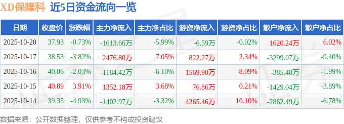 10月20日的资金流向数据方面,主力资金净流出1613.66万元,占总成交额5.99%,游资资金净流出6.59万元,占总成交额0.02%,散户资金净流入1620.24万元,占总成交额6.02%。