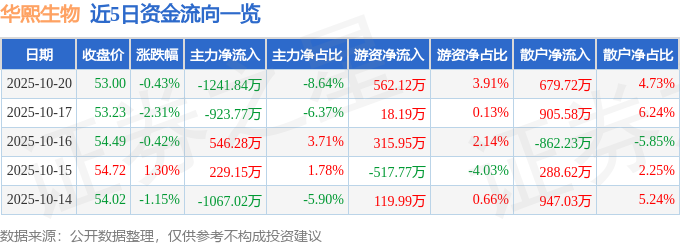 证券之星消息,截至2025年10月20日收盘,华熙生物(688363)报收于53.0元,下跌0.43%,换手率0.56%,成交量2.72万手,成交额1.44亿元。