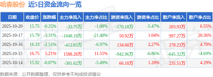 证券之星消息,截至2025年10月20日收盘,哈森股份(603958)报收于15.75元,下跌0.25%,换手率0.9%,成交量1.97万手,成交额3112.97万元。