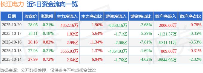 证券之星消息,截至2025年10月20日收盘,长江电力(600900)报收于28.05元,下跌0.21%,换手率0.38%,成交量91.42万手,成交额25.56亿元。