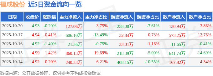 10月20日的资金流向数据方面,主力资金净流入127.06万元,占总成交额3.75%,游资资金净流出258.0万元,占总成交额7.61%,散户资金净流入130.94万元,占总成交额3.86%。