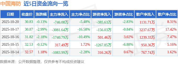 证券之星消息,截至2025年10月20日收盘,中国海防(600764)报收于30.83元,下跌0.13%,换手率0.62%,成交量4.43万手,成交额1.36亿元。