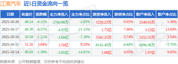 证券之星消息,截至2025年10月20日收盘,江淮汽车(600418)报收于48.24元,下跌0.12%,换手率1.75%,成交量38.3万手,成交额18.64亿元。
