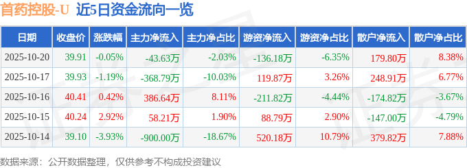 证券之星消息,截至2025年10月20日收盘,首药控股(688197)报收于39.91元,下跌0.05%,换手率0.83%,成交量5334.0手,成交额2145.17万元。