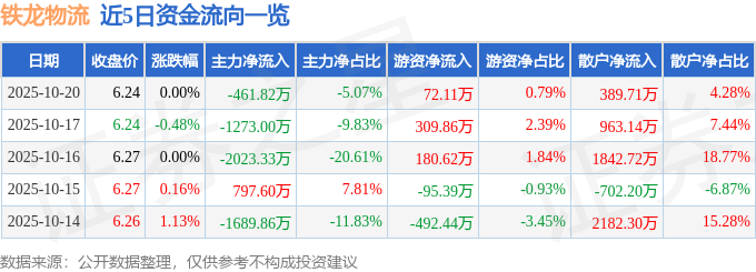 证券之星消息,截至2025年10月20日收盘,铁龙物流(600125)报收于6.24元,上涨0.0%,换手率1.12%,成交量14.63万手,成交额9114.72万元。
