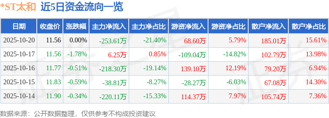 证券之星消息,截至2025年10月20日收盘,*ST太和(605081)报收于11.56元,上涨0.0%,换手率0.91%,成交量1.03万手,成交额1184.9万元。