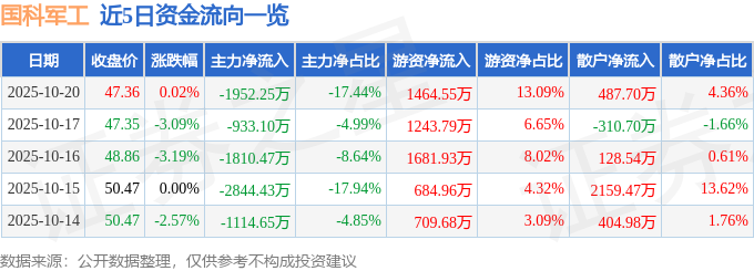 证券之星消息,截至2025年10月20日收盘,国科军工(688543)报收于47.36元,上涨0.02%,换手率2.03%,成交量2.35万手,成交额1.12亿元。