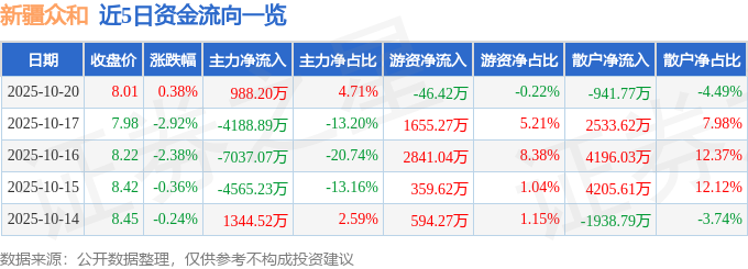 证券之星消息,截至2025年10月20日收盘,新疆众和(600888)报收于8.01元,上涨0.38%,换手率1.87%,成交量26.2万手,成交额2.1亿元。