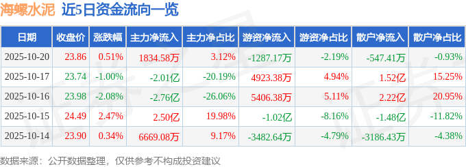 证券之星消息,截至2025年10月20日收盘,海螺水泥(600585)报收于23.86元,上涨0.51%,换手率0.62%,成交量24.73万手,成交额5.89亿元。