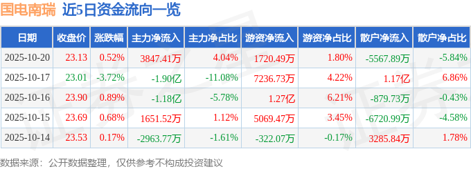 证券之星消息,截至2025年10月20日收盘,国电南瑞(600406)报收于23.13元,上涨0.52%,换手率0.51%,成交量41.16万手,成交额9.53亿元。
