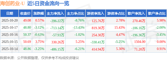 10月20日的资金流向数据方面,主力资金净流出396.22万元,占总成交额8.76%,游资资金净流入125.76万元,占总成交额2.78%,散户资金净流入270.46万元,占总成交额5.98%。