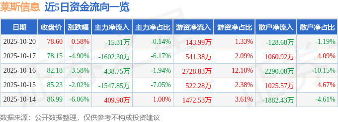 证券之星消息,截至2025年10月20日收盘,莱斯信息(688631)报收于78.6元,上涨0.58%,换手率2.11%,成交量1.37万手,成交额1.08亿元。