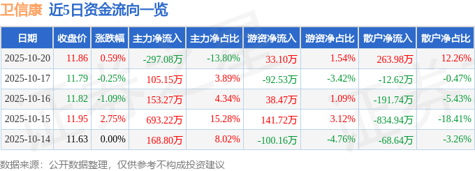 证券之星消息,截至2025年10月20日收盘,卫信康(603676)报收于11.86元,上涨0.59%,换手率0.42%,成交量1.83万手,成交额2152.58万元。