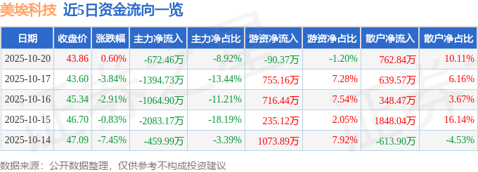 证券之星消息,截至2025年10月20日收盘,美埃科技(688376)报收于43.86元,上涨0.6%,换手率3.33%,成交量1.7万手,成交额7541.66万元。