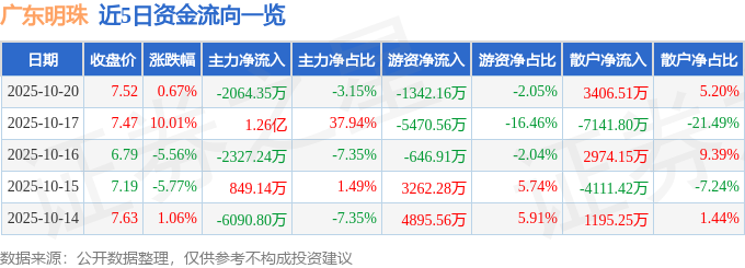 证券之星消息,截至2025年10月20日收盘,广东明珠(600382)报收于7.52元,上涨0.67%,换手率12.46%,成交量86.52万手,成交额6.55亿元。