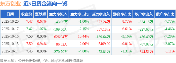 证券之星消息,截至2025年10月20日收盘,东方创业(600278)报收于7.47元,上涨0.67%,换手率0.66%,成交量5.78万手,成交额4300.72万元。