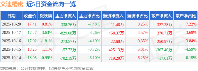 证券之星消息,截至2025年10月20日收盘,艾迪精密(603638)报收于17.41元,上涨0.81%,换手率0.31%,成交量2.61万手,成交额4531.24万元。