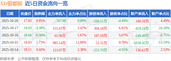 证券之星消息,截至2025年10月20日收盘,XD银都股(603277)报收于17.83元,上涨0.85%,换手率0.21%,成交量1.25万手,成交额2240.83万元。
