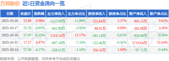 证券之星消息,截至2025年10月20日收盘,方邦股份(688020)报收于55.89元,上涨0.98%,换手率2.04%,成交量1.68万手,成交额9413.64万元。