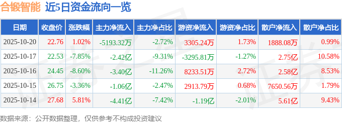 证券之星消息,截至2025年10月20日收盘,合锻智能(603011)报收于22.76元,上涨1.02%,换手率17.03%,成交量84.19万手,成交额19.07亿元。