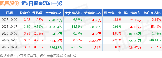证券之星消息,截至2025年10月20日收盘,凤凰股份(600716)报收于3.93元,上涨1.03%,换手率0.93%,成交量8.74万手,成交额3435.16万元。