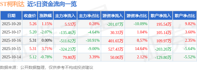 证券之星消息,截至2025年10月20日收盘,ST柯利达(603828)报收于5.26元,上涨1.15%,换手率0.64%,成交量3.81万手,成交额1992.09万元。
