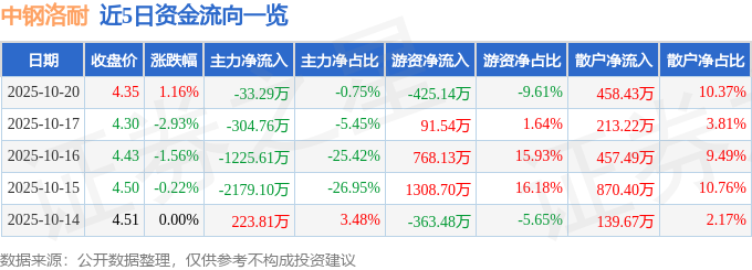 证券之星消息,截至2025年10月20日收盘,中钢洛耐(688119)报收于4.35元,上涨1.16%,换手率0.91%,成交量10.19万手,成交额4422.88万元。