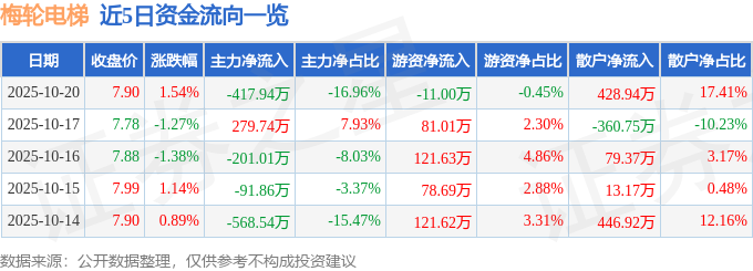 证券之星消息,截至2025年10月20日收盘,梅轮电梯(603321)报收于7.9元,上涨1.54%,换手率1.04%,成交量3.14万手,成交额2464.02万元。