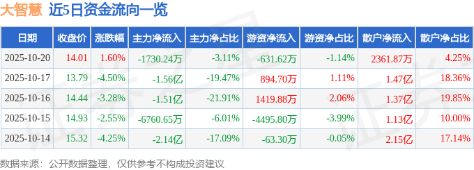 证券之星消息,截至2025年10月20日收盘,大智慧(601519)报收于14.01元,上涨1.6%,换手率1.99%,成交量39.65万手,成交额5.56亿元。