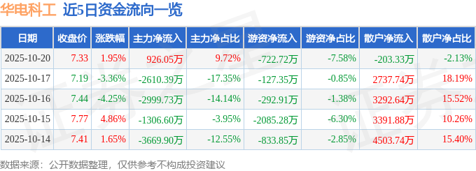 证券之星消息,截至2025年10月20日收盘,华电科工(601226)报收于7.33元,上涨1.95%,换手率1.12%,成交量13.07万手,成交额9529.04万元。