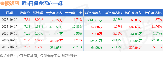 证券之星消息,截至2025年10月20日收盘,金陵饭店(601007)报收于7.31元,上涨2.09%,换手率1.65%,成交量6.43万手,成交额4675.41万元。