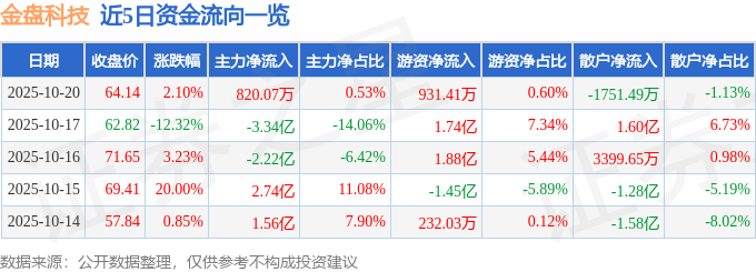 证券之星消息,截至2025年10月20日收盘,金盘科技(688676)报收于64.14元,上涨2.1%,换手率5.22%,成交量24.0万手,成交额15.57亿元。