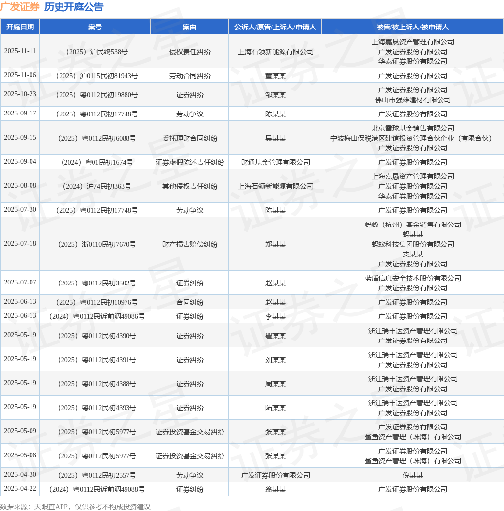案号:(2025)粤0112民初19880号根据统计,近一年内以广发证券股份有限公司为当事人的历史开庭公告有44则,其中案由为“证券纠纷”的公告以13则居首,其次为“证券投资基金交易纠纷”有9则,“证券虚假陈述责任纠纷”有5则。历史开庭公告(前20条)如下: