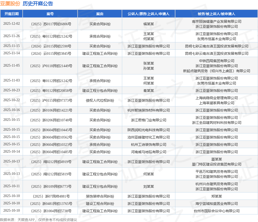 案号:(2025)粤0112民初20858号根据统计,近一年内以浙江亚厦装饰股份有限公司为当事人的历史开庭公告有543则,其中案由为“买卖合同纠纷”的公告以182则居首,其次为“劳务合同纠纷”有105则,“建设工程施工合同纠纷”有64则。历史开庭公告(前20条)如下: