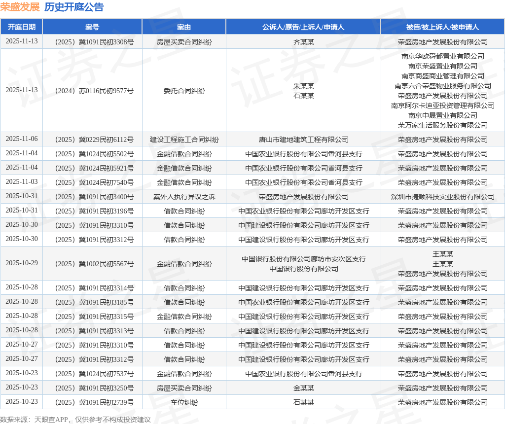 案号:(2025)冀1091民初2739号根据统计,近一年内以荣盛房地产发展股份有限公司为当事人的历史开庭公告有433则,其中案由为“借款合同纠纷”的公告以84则居首,其次为“票据追索权纠纷”有81则,“房屋买卖合同纠纷”有72则。历史开庭公告(前20条)如下: