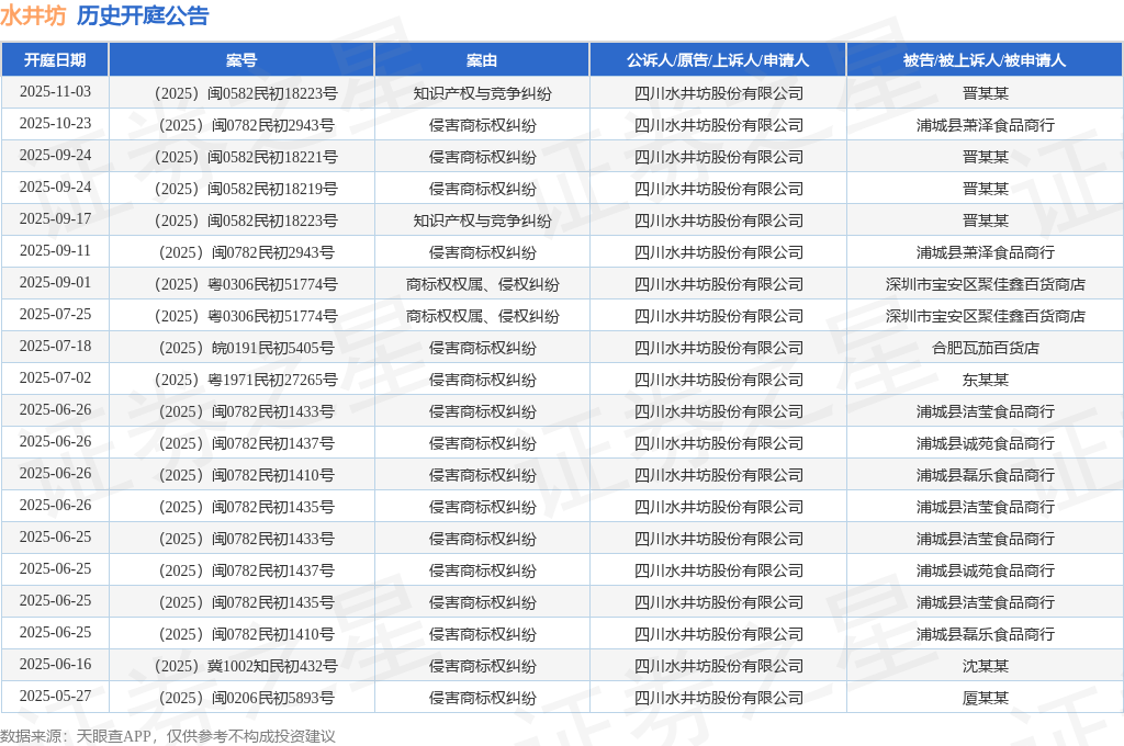 案号:(2025)闽0782民初2943号根据统计,近一年内以四川水井坊股份有限公司为当事人的历史开庭公告有27则,其中案由为“侵害商标权纠纷”的公告以20则居首,其次为“商标权权属、侵权纠纷”有3则,“知识产权与竞争纠纷”有2则。历史开庭公告(前20条)如下: