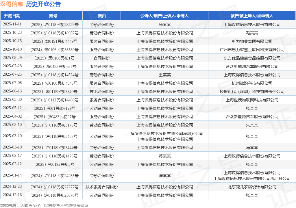 案号:(2025)沪0118民初18957号根据统计,近一年内以上海汉得信息技术股份有限公司为当事人的历史开庭公告有23则,其中案由为“劳动合同纠纷”的公告以11则居首,其次为“服务合同纠纷”有9则,“合同纠纷”有1则。历史开庭公告(前20条)如下: