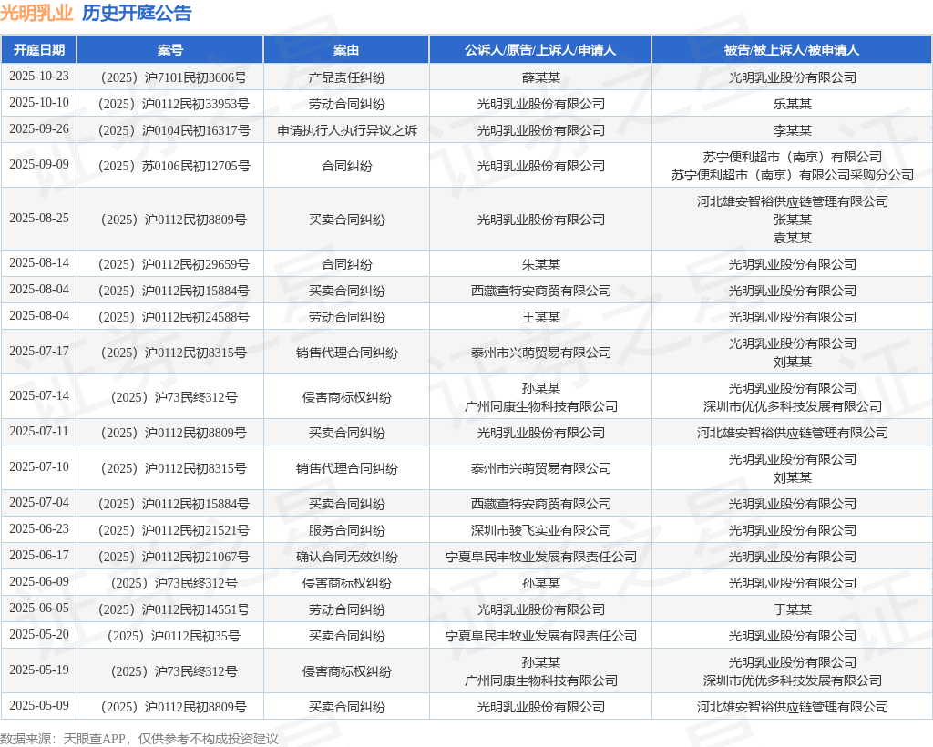 案号:(2025)沪7101民初3606号根据统计,近一年内以光明乳业股份有限公司为当事人的历史开庭公告有48则,其中案由为“买卖合同纠纷”的公告以14则居首,其次为“侵害商标权纠纷”有11则,“劳动合同纠纷”有8则。历史开庭公告(前20条)如下: