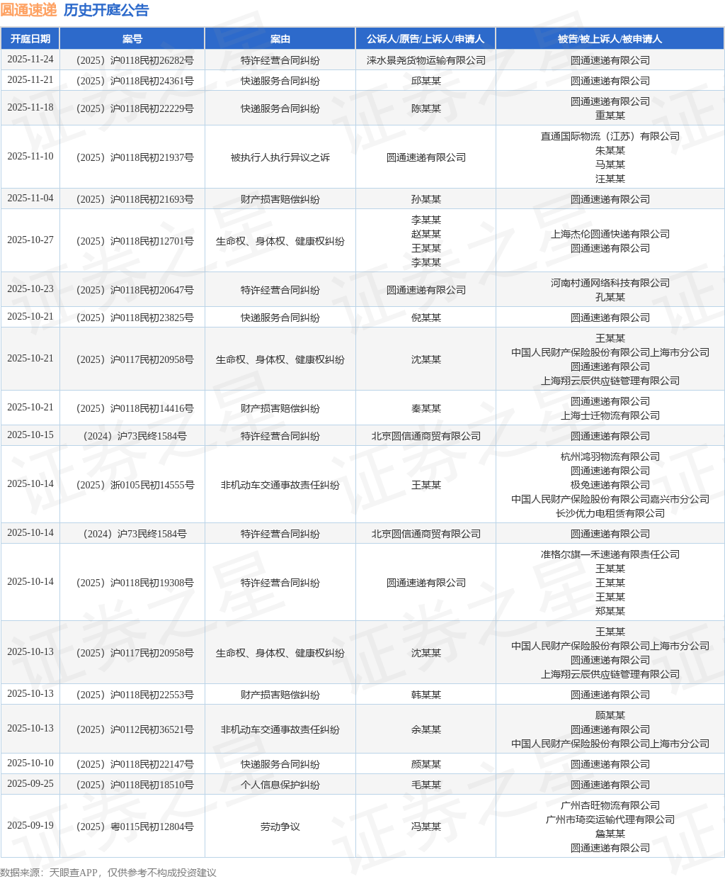 案号:(2025)沪0118民初20647号根据统计,近一年内以圆通速递有限公司为当事人的历史开庭公告有157则,其中案由为“快递服务合同纠纷”的公告以35则居首,其次为“特许经营合同纠纷”有26则,“机动车交通事故责任纠纷”有14则。历史开庭公告(前20条)如下:
