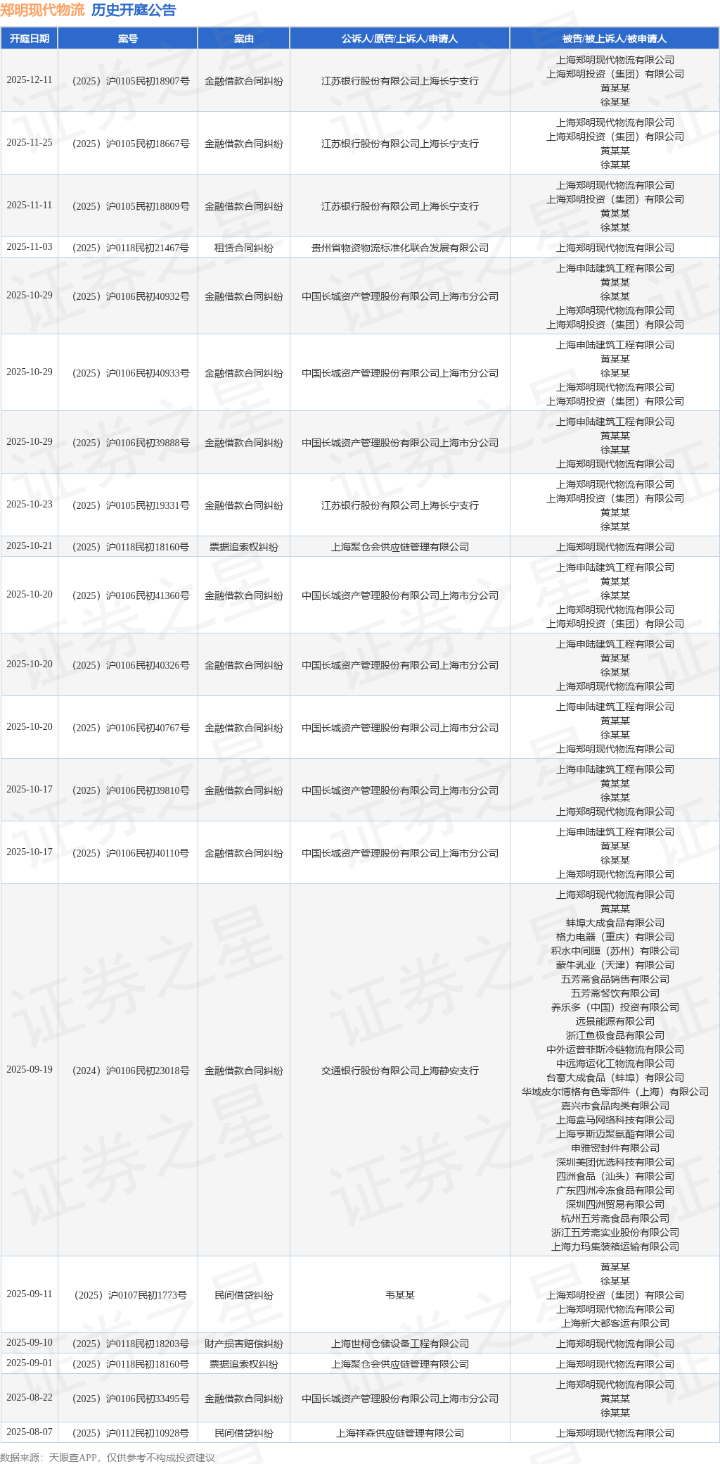 案号:(2025)沪0105民初19331号根据统计,近一年内以上海郑明现代物流有限公司为当事人的历史开庭公告有109则,其中案由为“金融借款合同纠纷”的公告以53则居首,其次为“劳动合同纠纷”有11则,“民间借贷纠纷”有5则。历史开庭公告(前20条)如下: