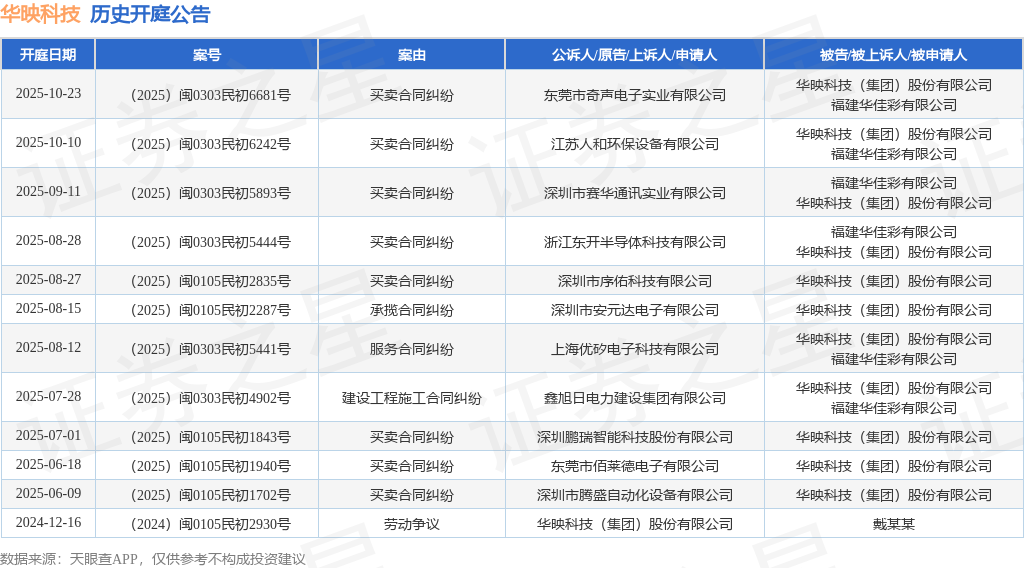 案号:(2025)闽0303民初6681号根据统计,近一年内以华映科技(集团)股份有限公司为当事人的历史开庭公告有12则,其中案由为“买卖合同纠纷”的公告以8则居首,其次为“劳动争议”有1则,“建设工程施工合同纠纷”有1则。历史开庭公告如下: