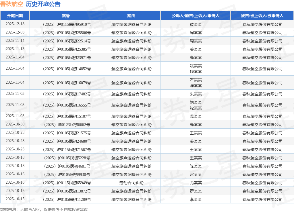 案号:(2025)沪0115民初71567号根据统计,近一年内以春秋航空股份有限公司为当事人的历史开庭公告有105则,其中案由为“航空旅客运输合同纠纷”的公告以64则居首,其次为“网络服务合同纠纷”有15则,“劳动合同纠纷”有12则。历史开庭公告(前20条)如下: