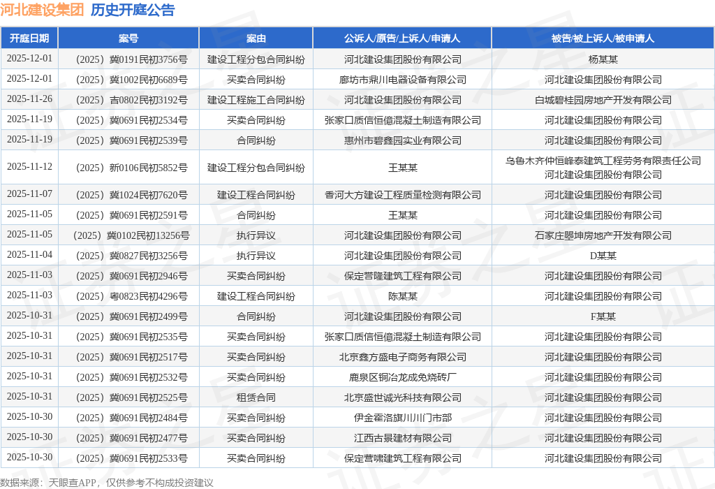 案号:(2025)冀0628民初2519号根据统计,近一年内以河北建设集团股份有限公司为当事人的历史开庭公告有1565则,其中案由为“买卖合同纠纷”的公告以634则居首,其次为“建设工程施工合同纠纷”有218则,“劳务合同纠纷”有122则。历史开庭公告(前20条)如下: