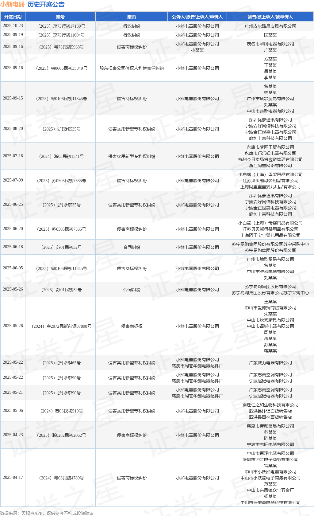 案号:(2025)京73行初17189号根据统计,近一年内以小熊电器股份有限公司为当事人的历史开庭公告有30则,其中案由为“侵害商标权纠纷”的公告以12则居首,其次为“侵害实用新型专利权纠纷”有11则,“合同纠纷”有3则。历史开庭公告(前20条)如下: