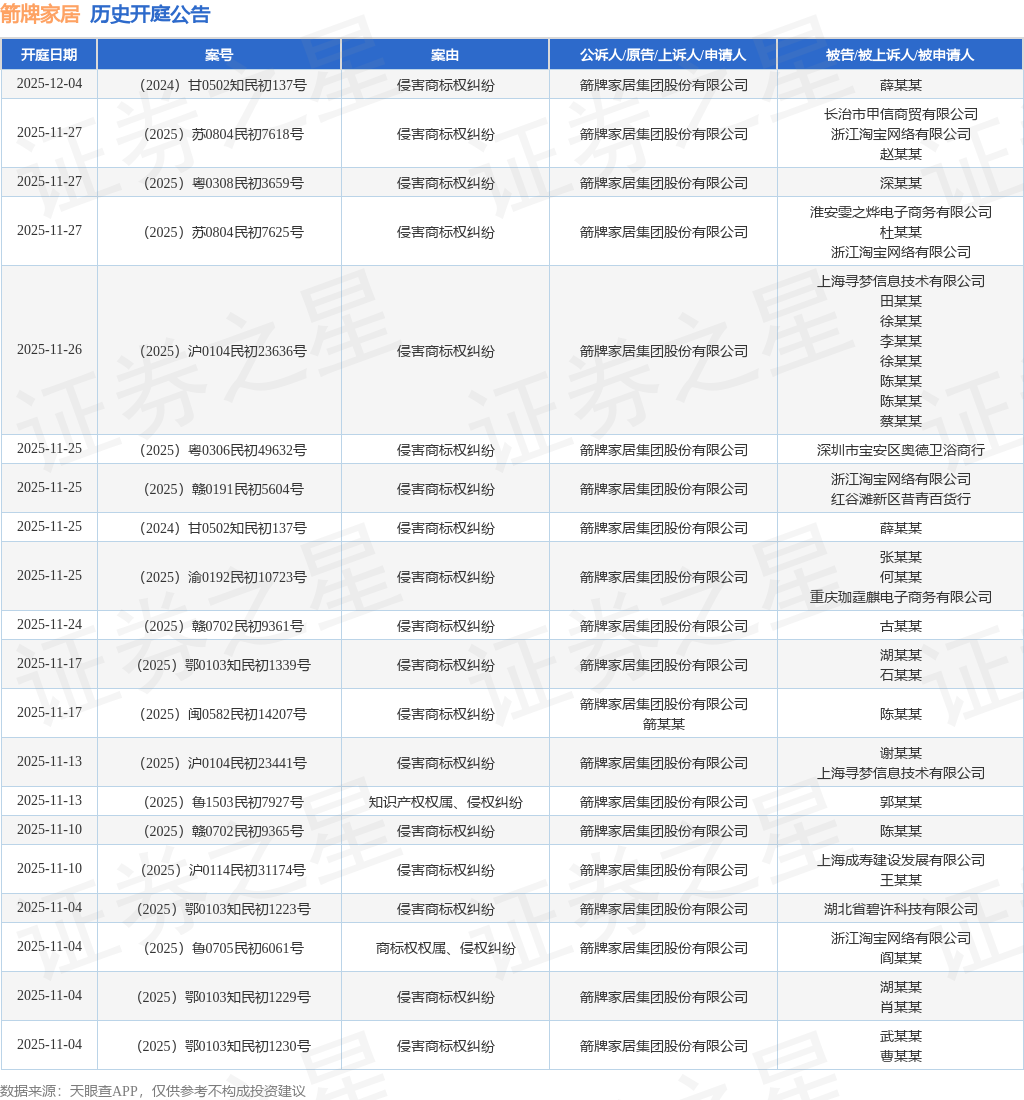 案号:(2025)闽0526民初4718号根据统计,近一年内以箭牌家居集团股份有限公司为当事人的历史开庭公告有513则,其中案由为“侵害商标权纠纷”的公告以445则居首,其次为“商标权权属、侵权纠纷”有23则,“不正当竞争纠纷”有8则。历史开庭公告(前20条)如下: